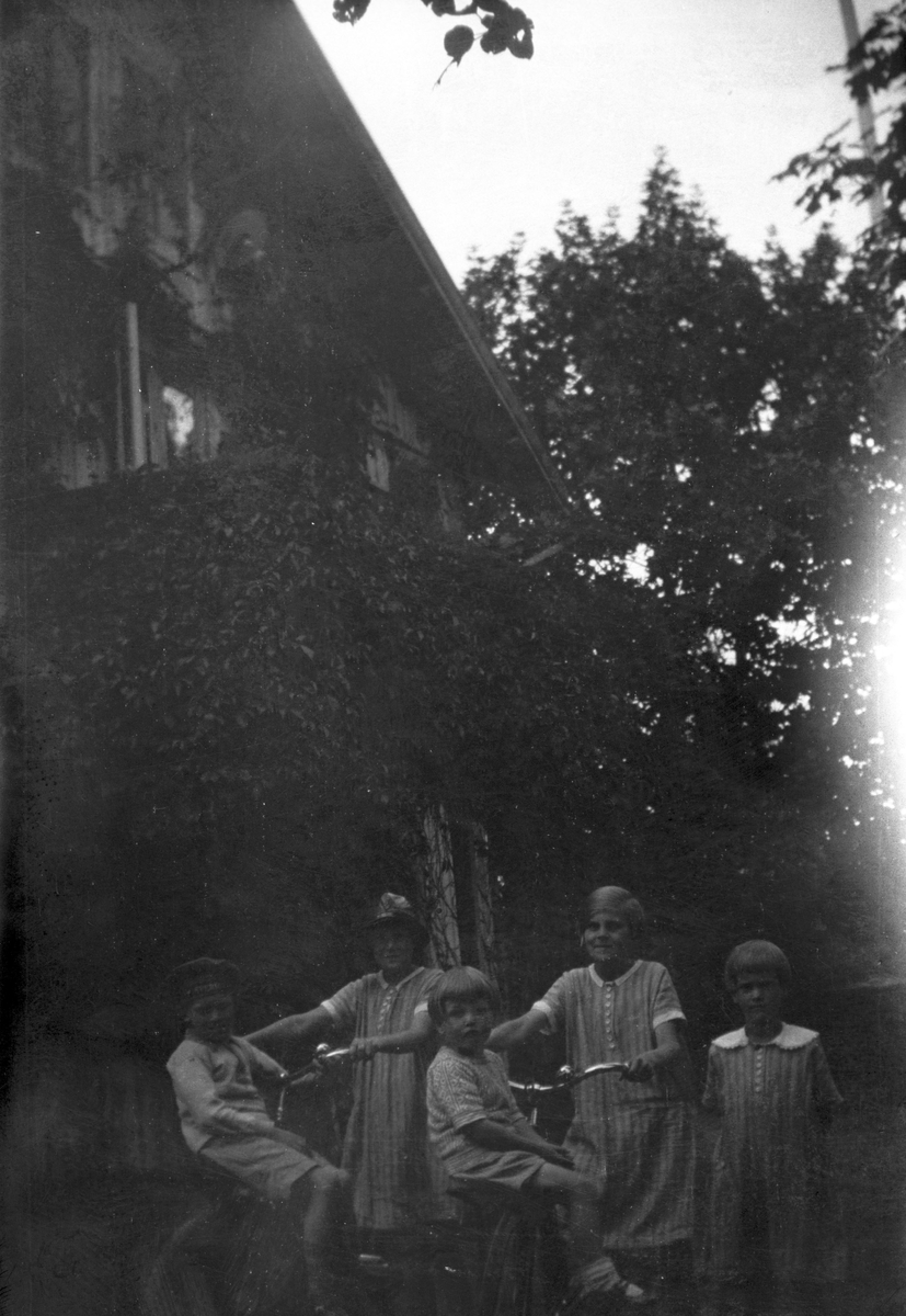 Lingbo, syskonen Brundin med kusin. Från vänster: Gunnar Malmberg som sitter på Karins pakethållare, Sören som sitter på Ingrids pakethållare och Eva längst till höger utan cykel.