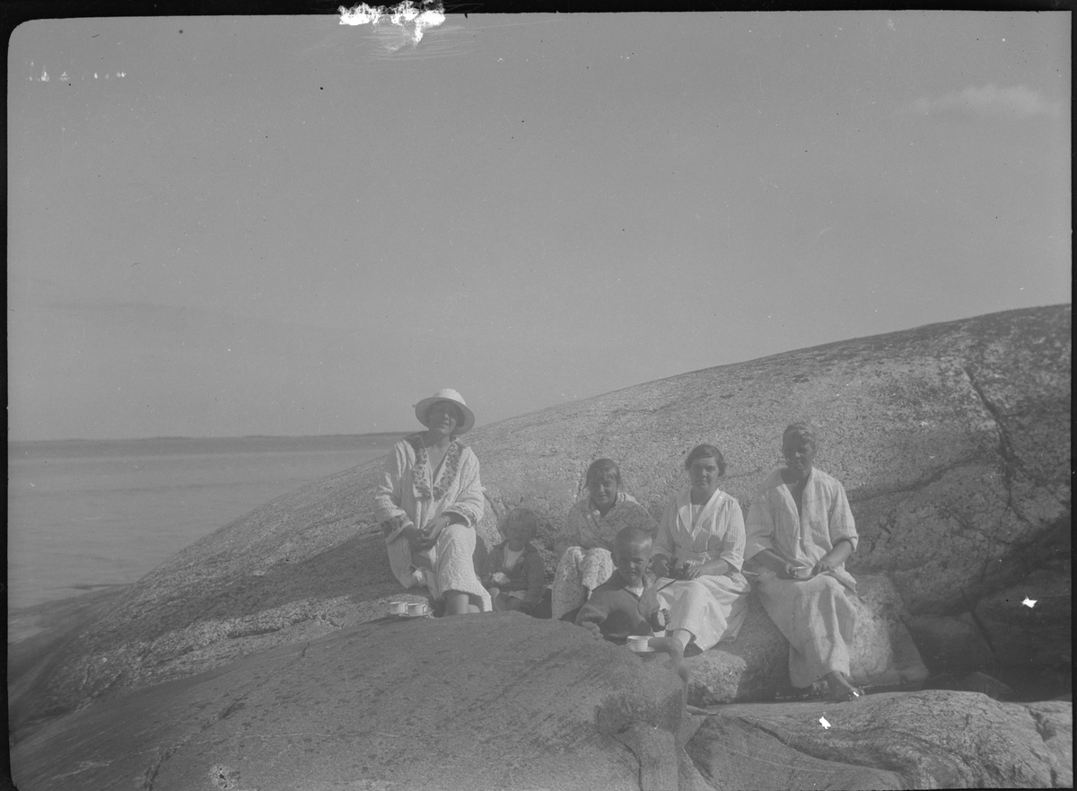 Det här torde vara i Furuvik, kanske på Stora Furuskär. Från vänster Elna Brundin, personerna i mitten okända, till höger Elnas halvsyster Lisa (Elisabet).