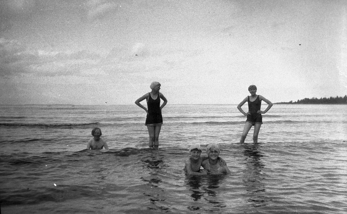 Rullsand. Längst fram "Ninnan" Lilian Holmstedt med sin kusin Eva Brundin. I mitten står Karin Brundin, till höger Ingrid Brundin och till vänster arrendator Lundbergs dotter Eva i Brämsand. Foto 1928.