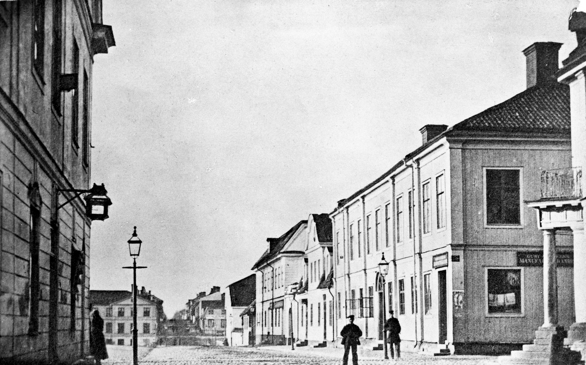 Norra Kungsgatan hörnet av Drottninggatan utsikt söderut. I bakgrunden till vänster Rettigska villan med adress Södra Kungsgatan 1. Bilden är tagen före branden 1869. Huset närmast till vänster står i nuvarande esplanaden.