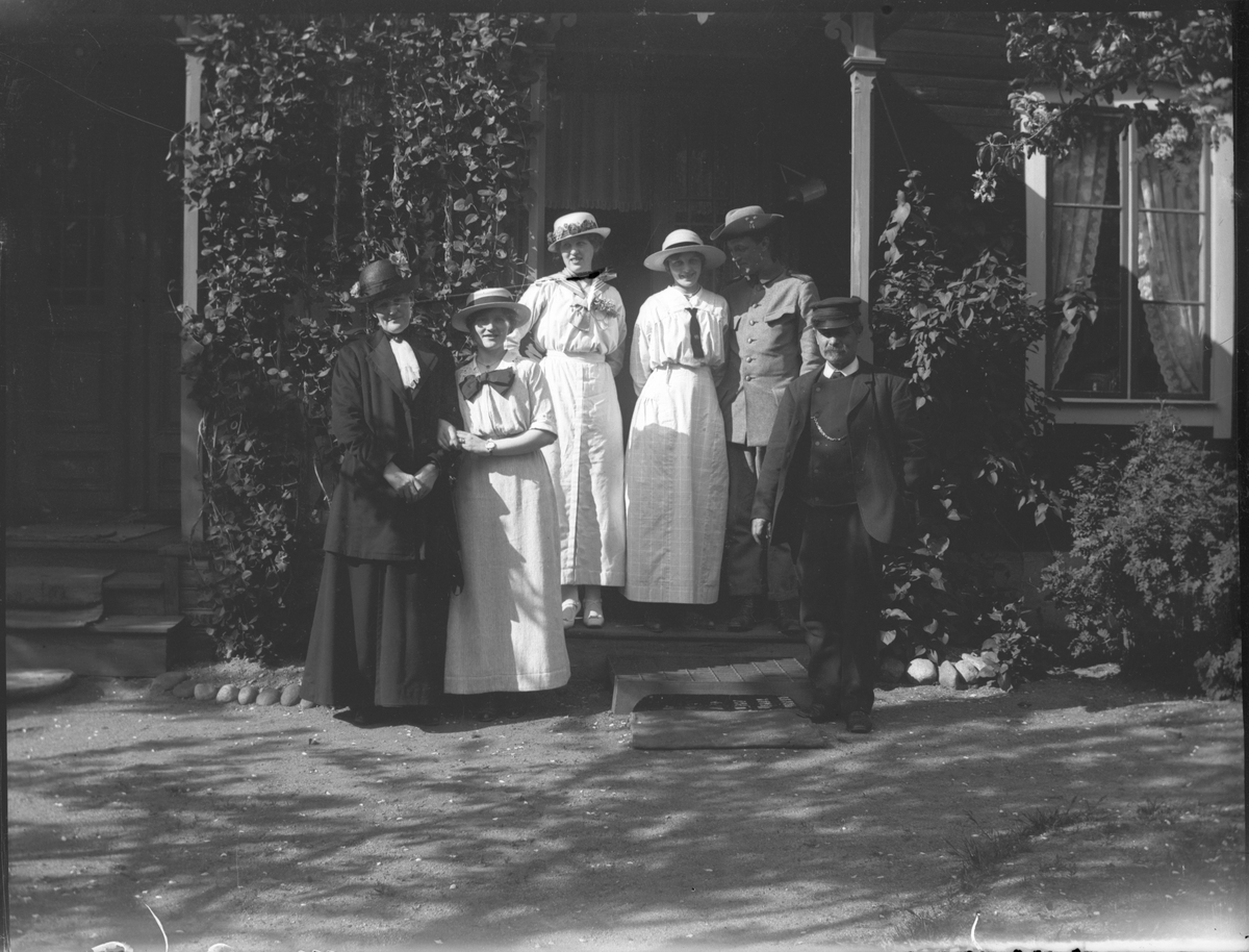 Obekant miljö. Personerna från vänster: Anna Larsdotter Olsson med sina tre döttrar Gertrud, Ingeborg och Naemi med uppvaktande kavaljer (möjligen Helmer Andersson, David Brundins kompanjon i firma Andersson och Brundin 1913). Mannen till höger okänd.