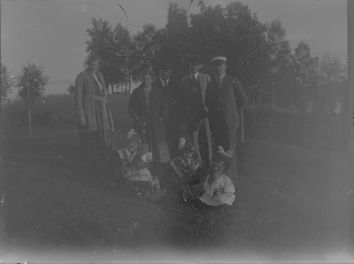 Elna Brundin till vänster med döttrarna Karin, Ingrid och Eva. Längst till höger står en man som kallades "Moffa", till vänster om honom David Brundin. Övriga okända.