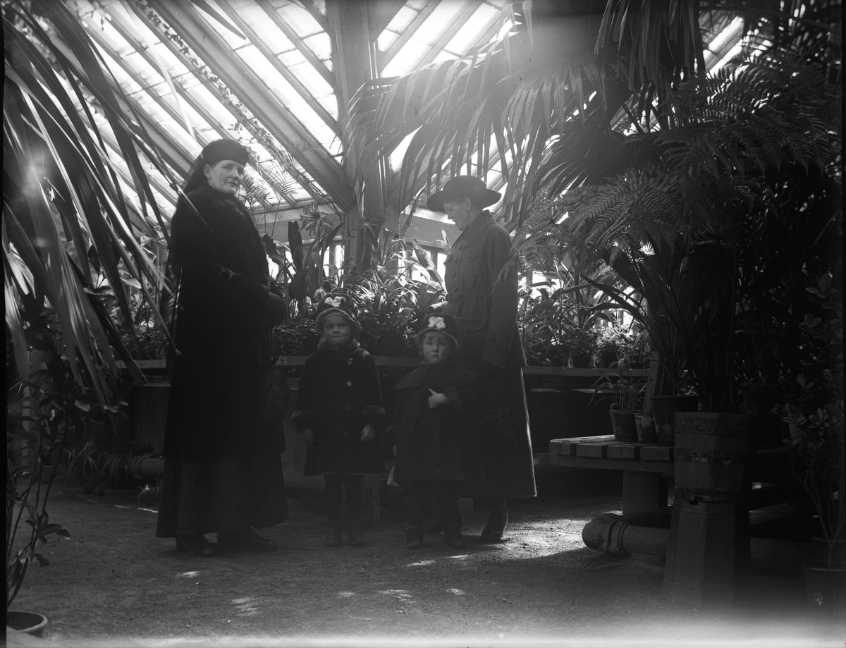 Elna Brundin till höger med sina döttrar Karin och Ingrid. Till vänster Elnas mor Anna Larsdotter Olsson. Dom är i ett växthus, antagligen för att köpa en palm, som var väldigt vanliga i hemmen på den tiden.