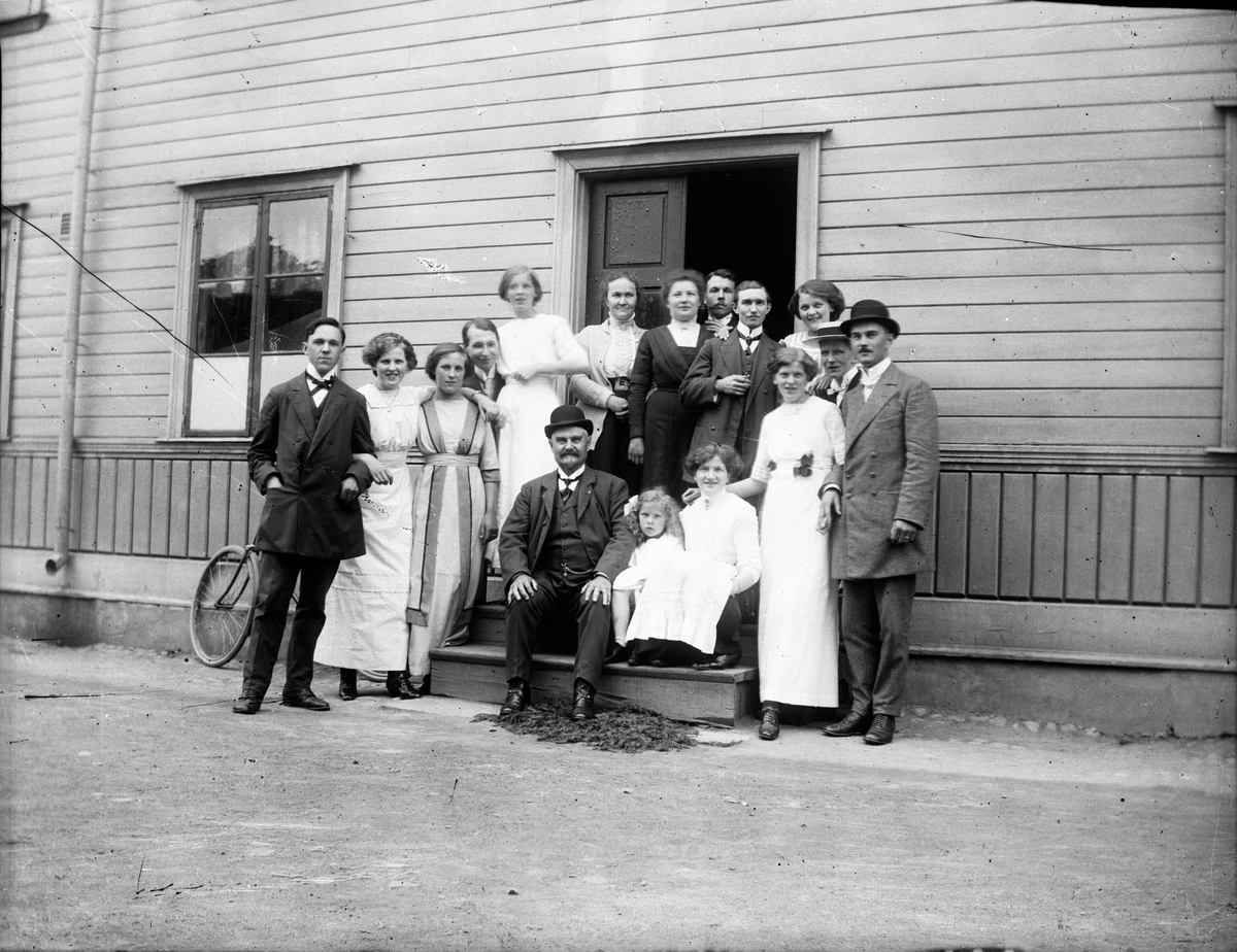 Här är en samling släktingar som sitter på 3:e Tvärgatan 15, utanför entrén till Anna Larsdotter Olssons lägenhet en trappa upp. Personerna från vänster: Erik Rynning med Naemi Olsson, Elnas kusin Anna Larsson, Ingeborg Olsson, Kerstin Brundin, Ester och John Hedman, Adde och Hildur Holmstedt (halvsyster till David Brundin). Längst till höger står David Brundin med Elna, sittande Gertrud Olsson med en dotter (Lisa) till Ester och John Hedman, och slutligen i mitten Anders Johan Brundin. Jämför bild nr EB 684.