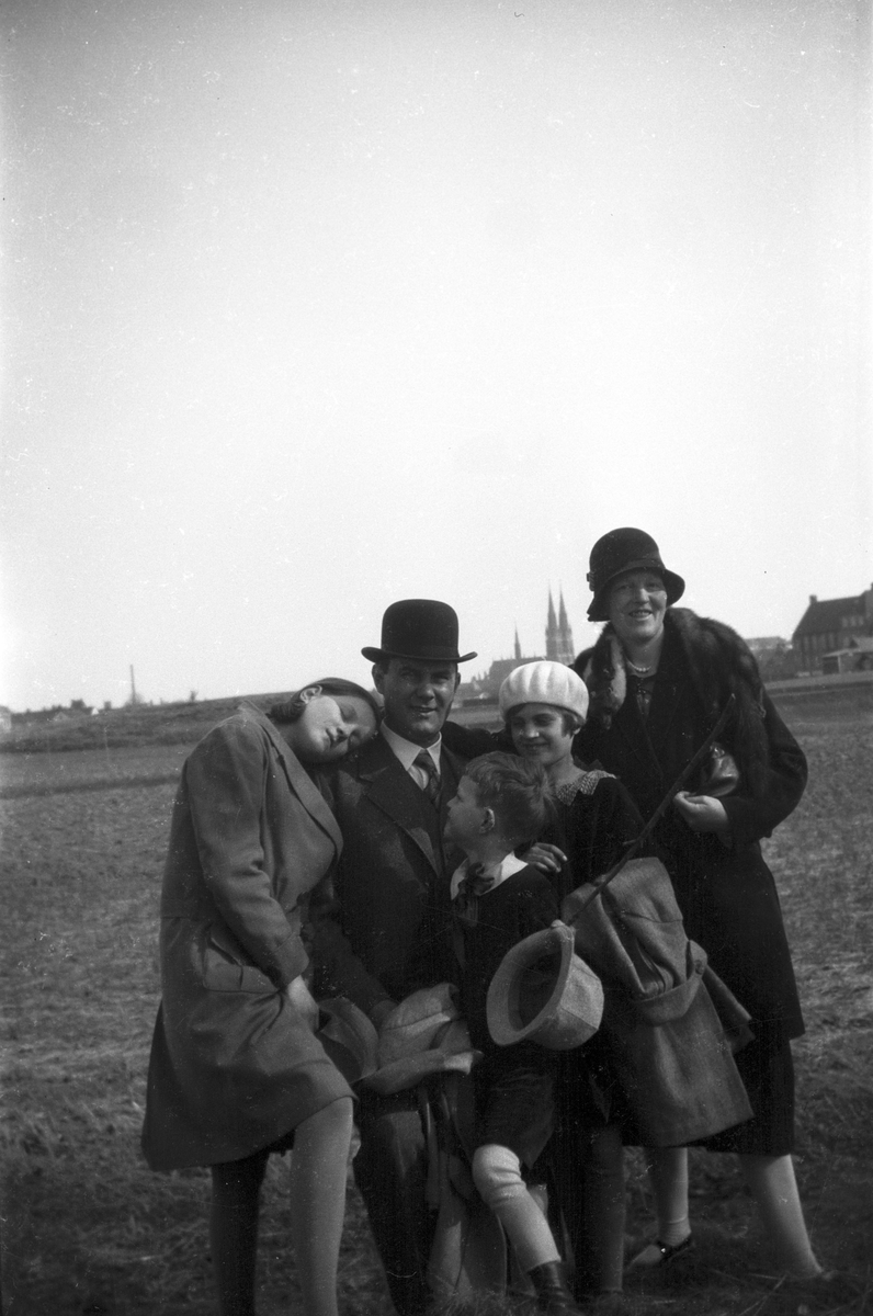 Familjen Brundin gjorde ofta utflykter med bil, gärna till Uppsala, där David hade sina rötter. Det här är vid Nyåker, där Davids far hade två tegelbruk, Nyåkers tegelbruk och Norra tegelbruket. Från vänster: Ingrid, David, Eva och Elna Brundin. Sören står längst fram. Foto ca 1928.
