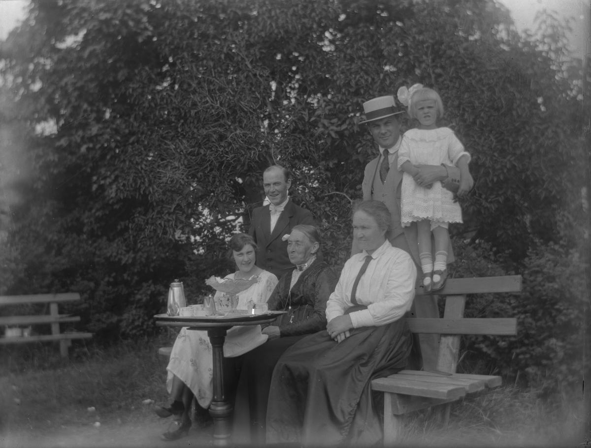 Det här är antagligen på en gård i Strömsbro. Det är farmor Kerstin Brundin sittande i mitten och bakom henne David Brundin med dottern Eva. Övriga är släktingar till Einar Olssons hustru Ellen.