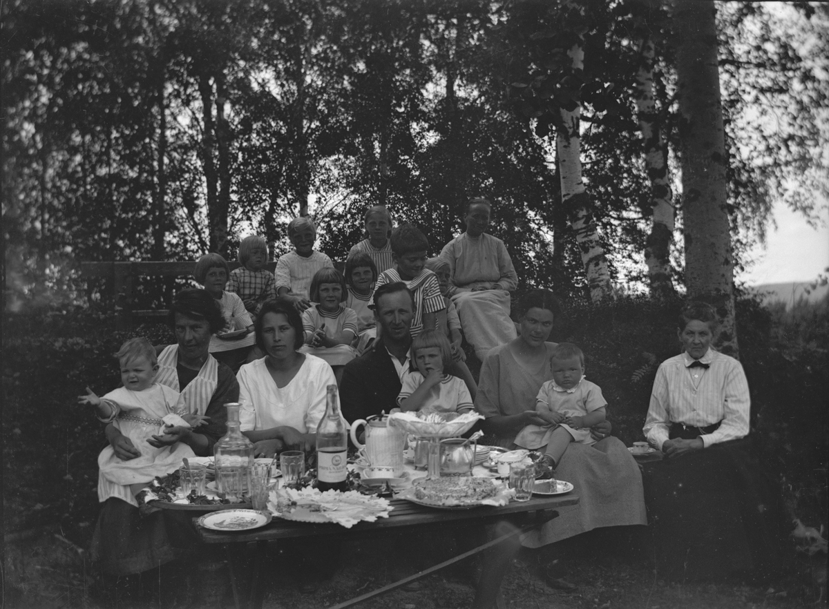 Ett sällskap, förmodligen i Harnäs. Sören Brundin sitter längst till vänster i knät på en okänd dam. Hans systrar är även med på bilden.