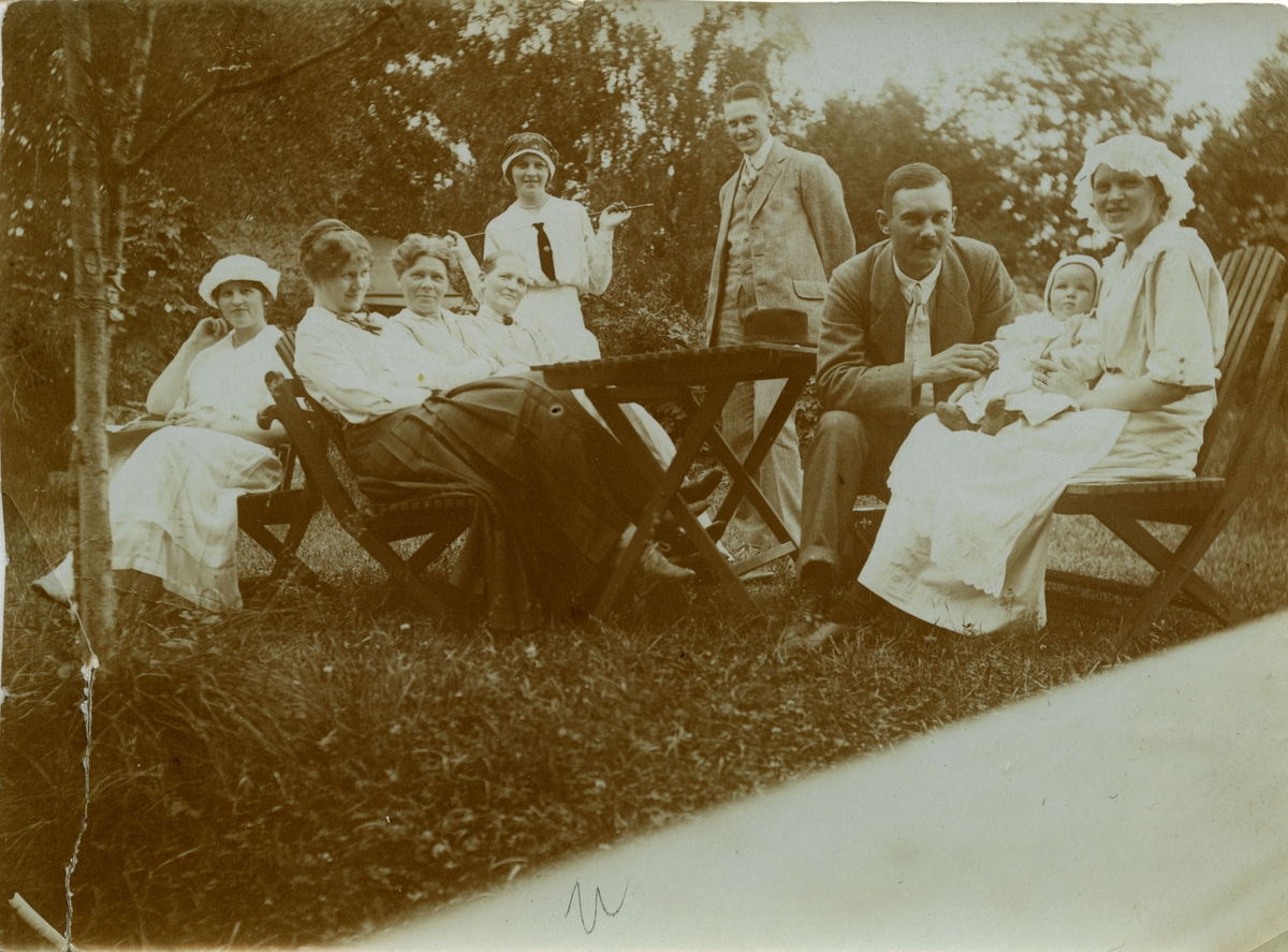 En grupp släktingar, Elna och Ingrid Brundin sitter längst till höger, till vänster om dom David, därefter Rickard Malmberg, som gifte sig med Elnas syster Ingeborg. Övriga är systrar och kusiner till Elna samt Elnas mor Anna Larsdotter Olsson (fjärde kvinnan från vänster).