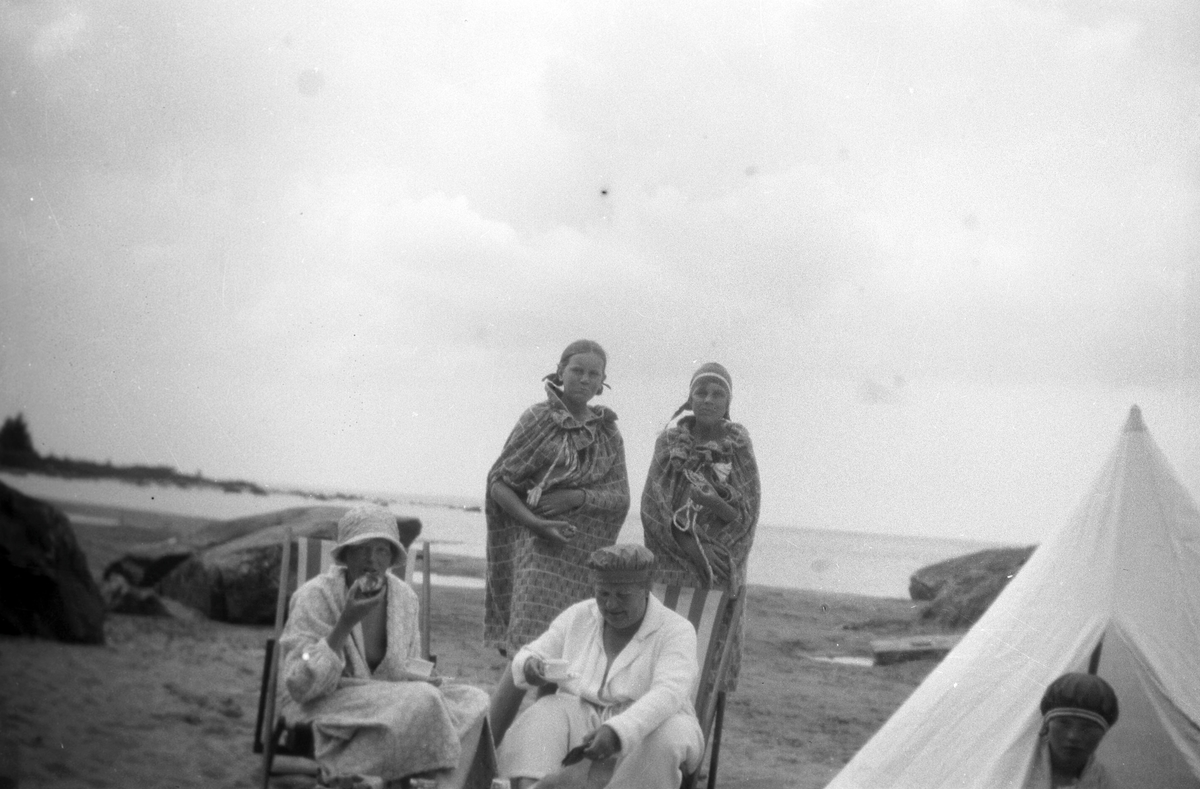 Rullsand, Elna Brundin sitter till vänster och äter en smörgås med en syster till David, Ester Hedman. Bakom står flickorna Brundin.
