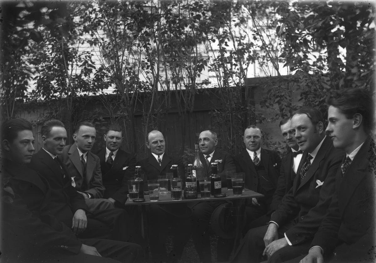 Män samlade kring ett "groggbord". Tredje person från höger är fotografen själv, Karl Johan Östergren.