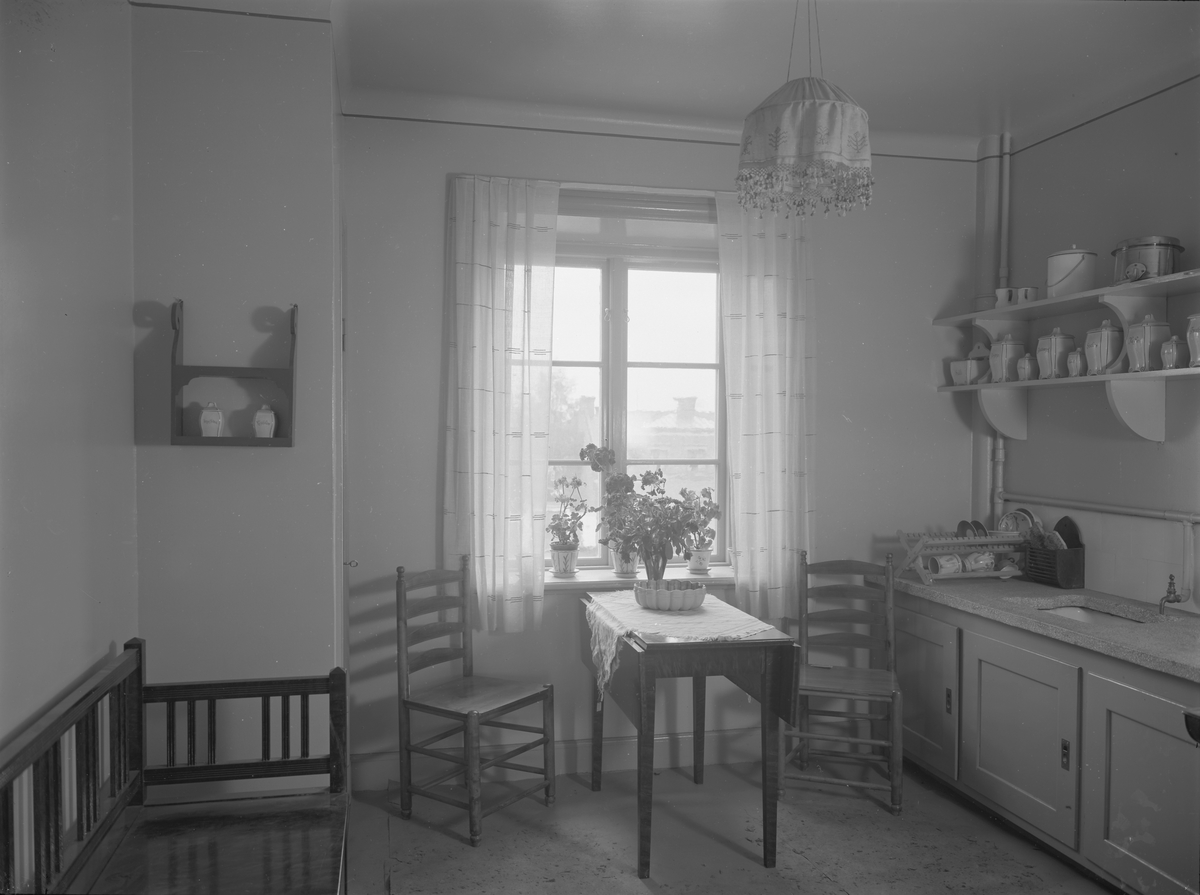 Utställningsinteriör med köksinredning. möbler, inredningstextilier och porslin.