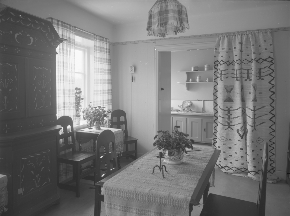 Utställningsinteriör med köksinredning. möbler, inredningstextilier och porslin.