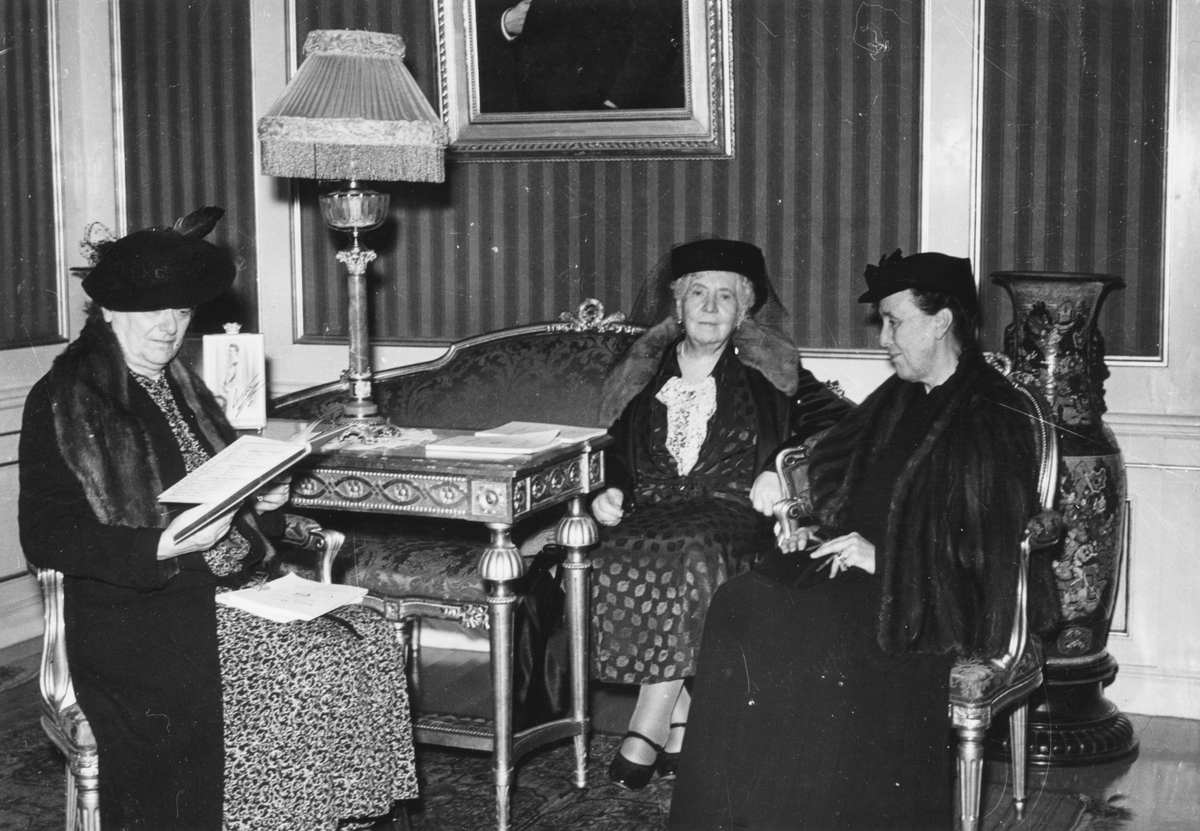 Friherrinan Sophie Louise Von Plessen, Köpenhamn i mitten samt och till höger i i bild Anna Von Rettig. Åbo, sitter i Rettigsksa rummet i samband med museets invigning 19 oktober 1940.