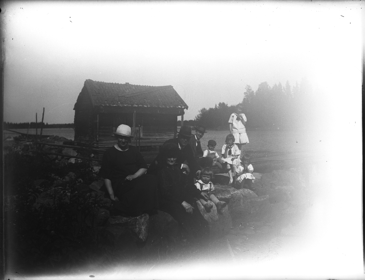 Troligen i Sikvik. Längst till vänster Ellen Olsson, en svägerska till Elna Brundin, därefter Anna Larsdotter Olsson (Elnas mor) och bakom henne David Brundin. Sören Brudin sitter tillsammans med mormodern Anna. Övriga barn Brundin i bakgrunden tillsammans med Einar Olsson och hans son Bengt. Bilden kan var från 1923-24.