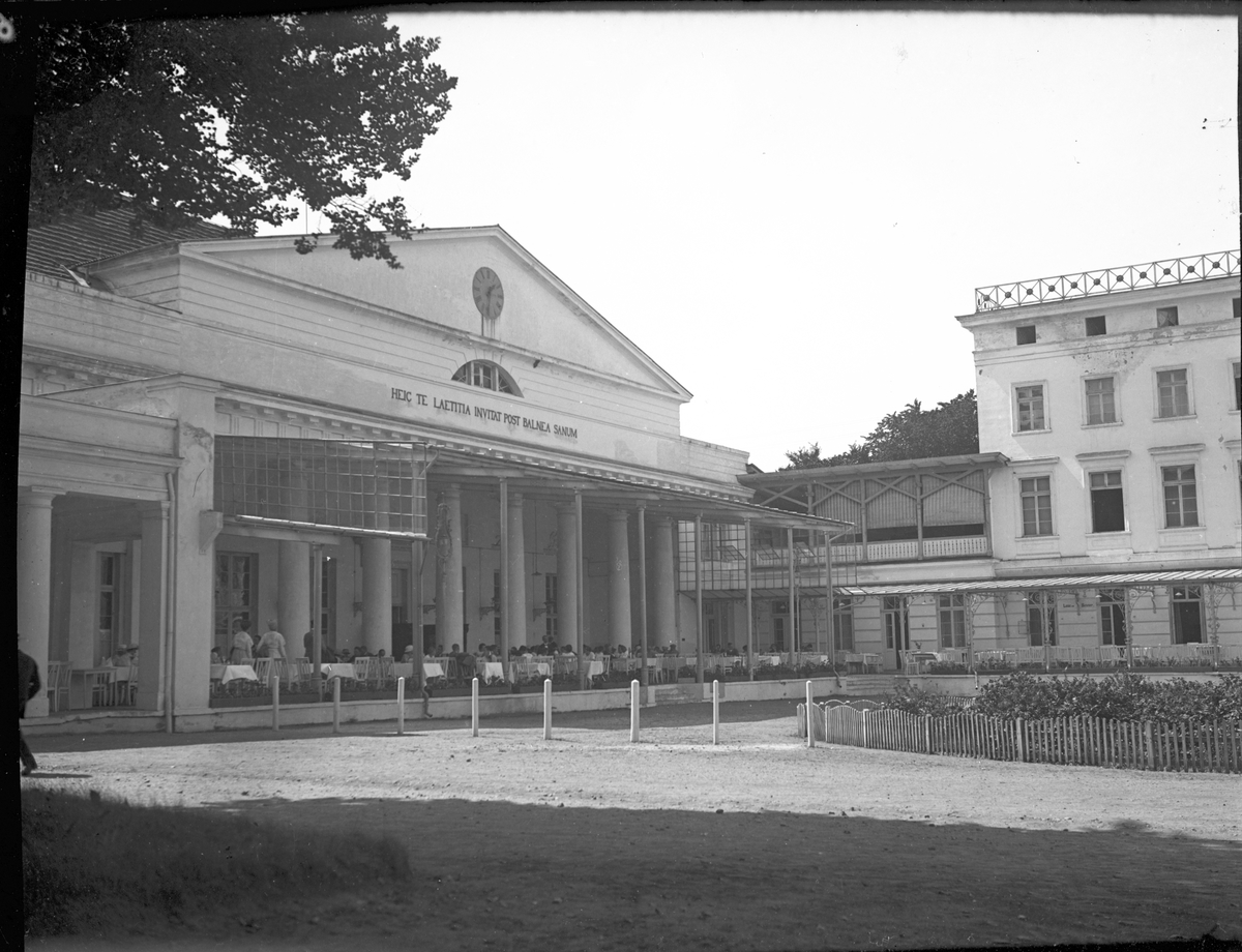 Obekant byggnad med en devis på latin, möjligen en kurort i norra Tyskland.