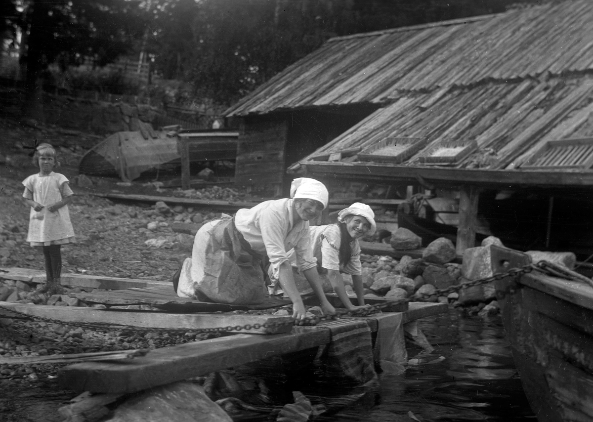 Obekanta, möjligen kusiner till Elna som skurar mattor i Lingbo. Till vänster står förmodligen Karin Brundin.