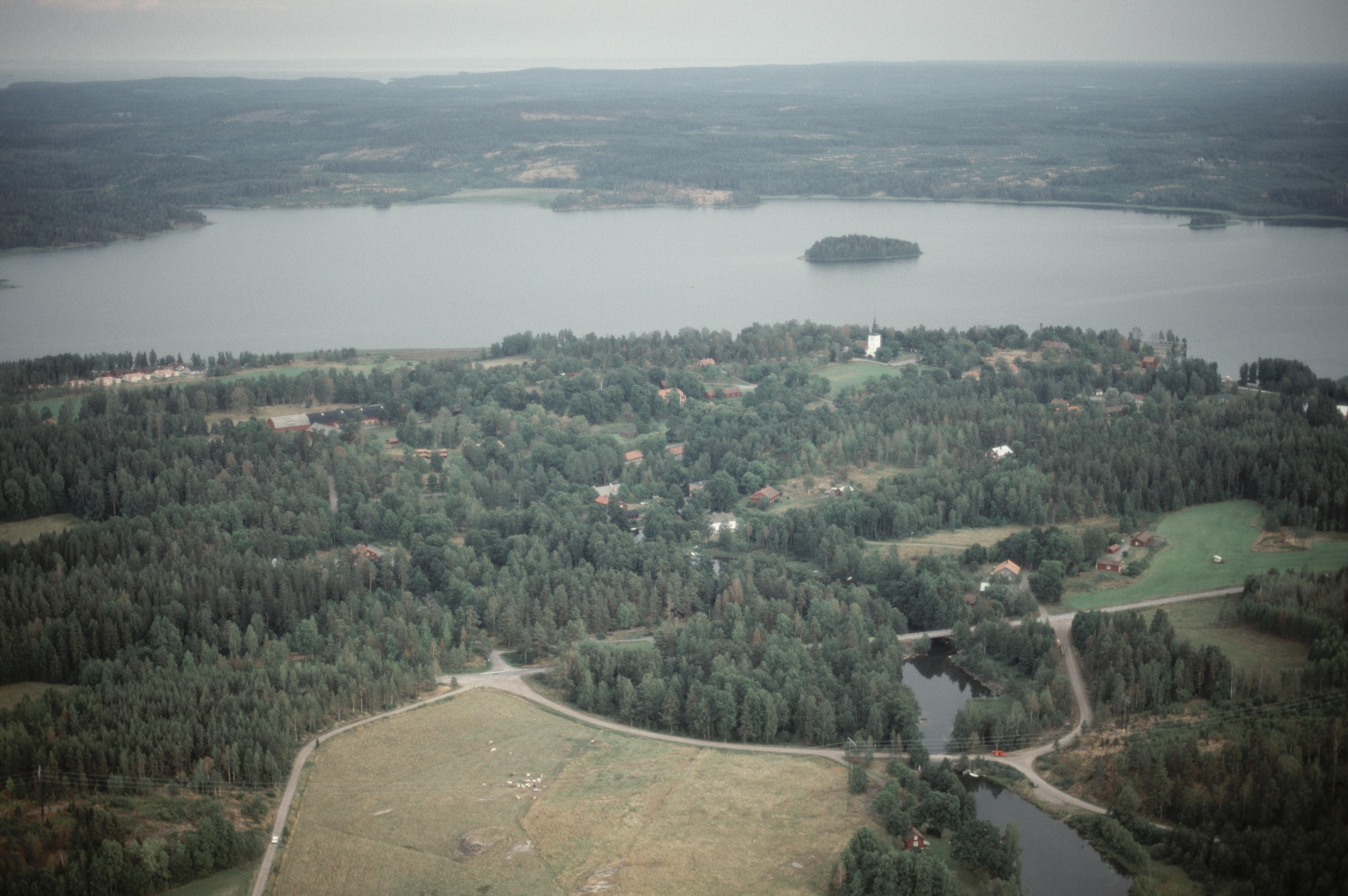 Borgviks bruk vid Borgvikssjön. Borgvikeälven i bildens nedre del. Borgviks kyrka till höger om bildens mitt. Bilden är tagen mot (väderstreck): SSO