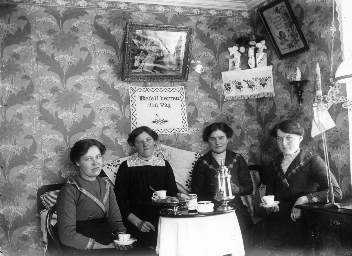Fyra kvinnor dricker kaffe.