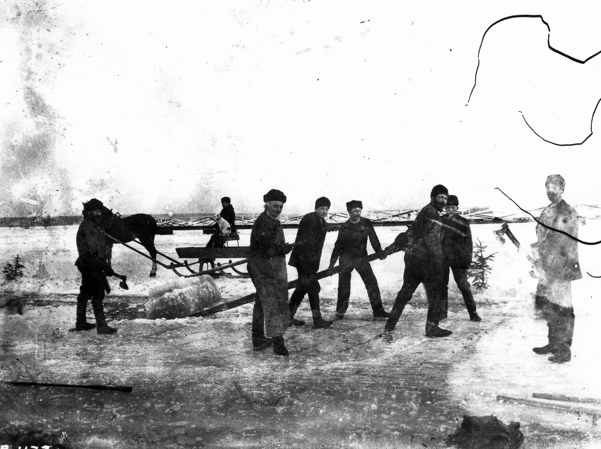 Isupptagning. Sju män tar upp is, en man på hästdragen släde i bakgrunden.