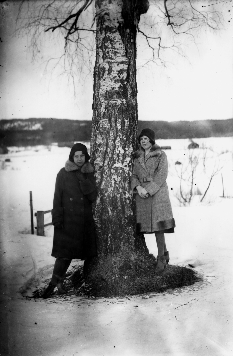 Signe Åberg, Åmot (till vänster) och Hulda Strid, Västerbo (till höger) lutar sig mot björken.