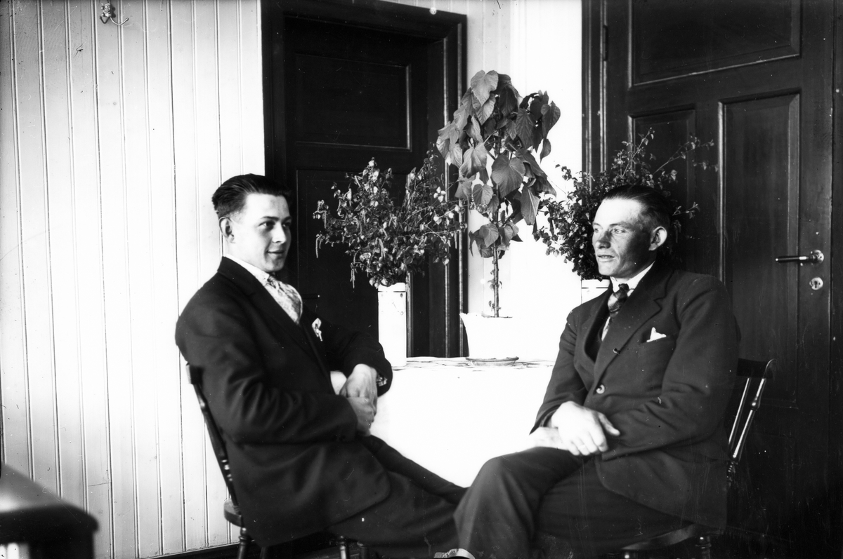 Titel: Sittande vid bordet, till vänster Per Lindgren, Vallsbo, till höger Karl Blom, Västerbo.