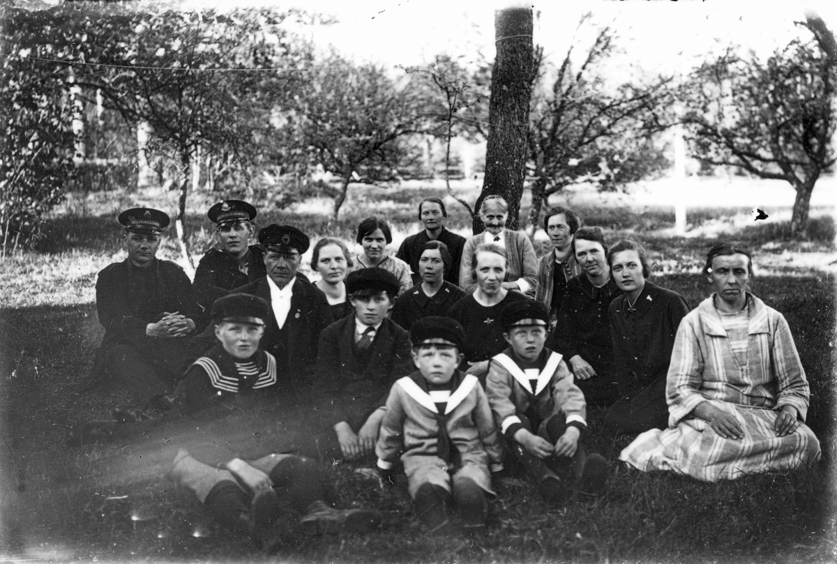 Frälsningsarmén har möte i Gnupen. Pojkarna sittande från vänster: Allan Larsson (Vallsbo), Gunnar Larsson (Vallsbo), Erland Jonsson och Folke Jonsson (Vallsbo). Mannen nr 3 från vänster Efraim Jonsson. Den gamla damen vid trädet Brita Jonsson (Efraims mor). Övriga är Nanny Lundkvist, Beda Svedlund, Maria Jonsson och Lotten. Frälsningssoldaterna okända.