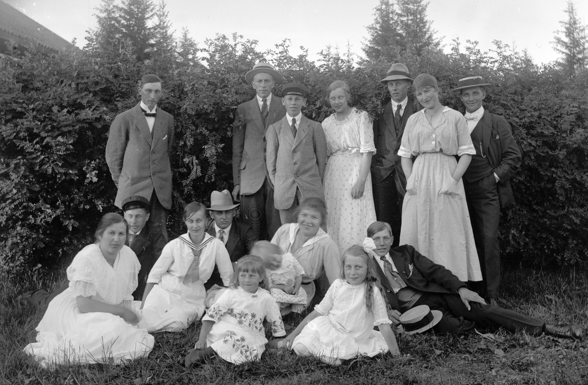 Sittandes med hatt Enok Eriksson, stående damen längst till höger Edit Olsson, Nordansjö.