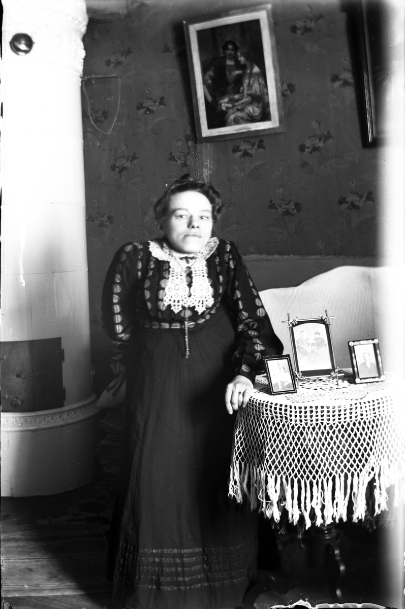 Porträtt, kvinna. Kakelugn i bakgrunden.