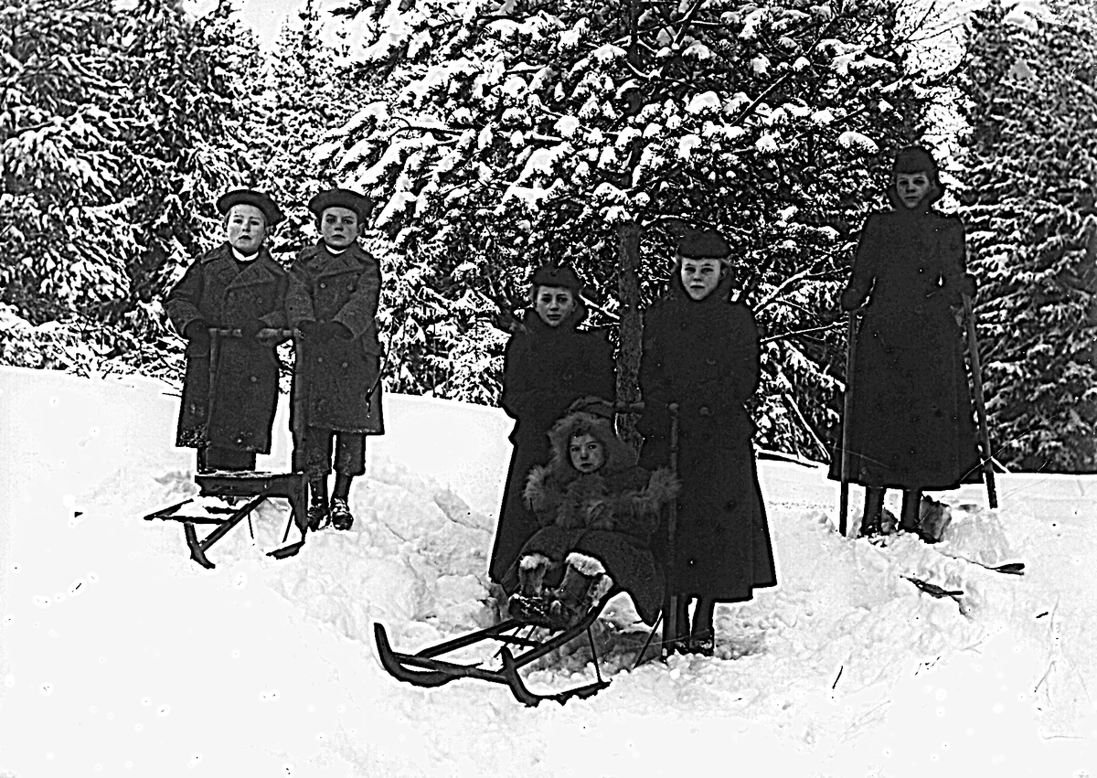 Personerna från vänster: Erik, Anders, Ingrid, Marta (på sparken), Anna, Brita, alla med efternamnet Jonsson. De bodde på "Håbacken". Foto i januari 1902.