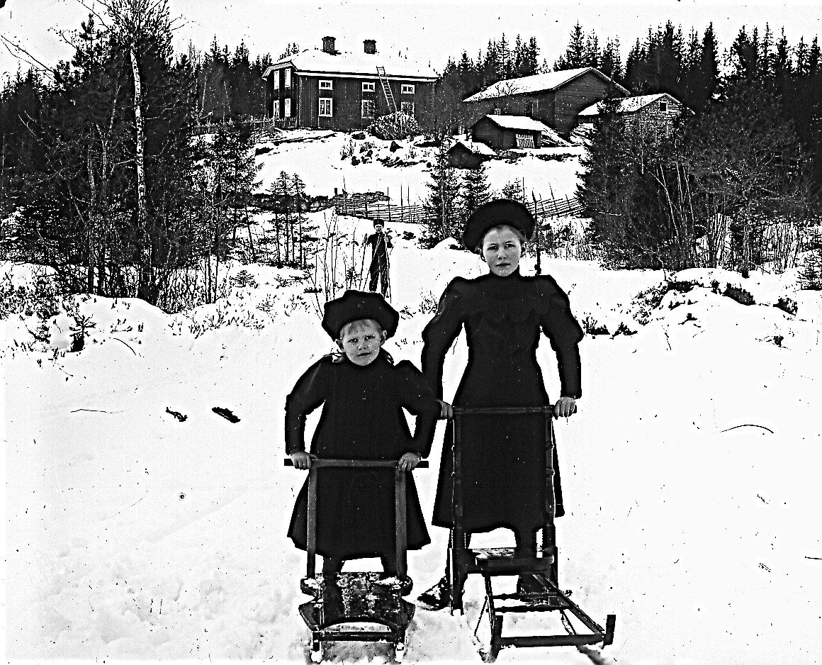 Bakom "Lindbergs" i Östansjö. Per Lindberg i bakgrunden, Elvira och Ester i förgrunden.