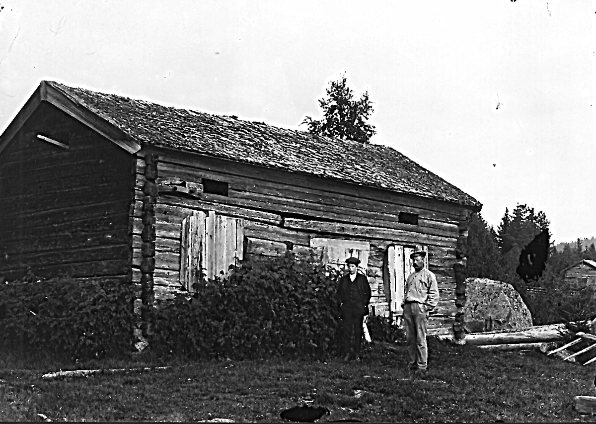 Olle Nyström med sonen Lars framför "Losandreas stuga" i Finnfara (Höstbodarna). Foto den 26 augusti 1915.