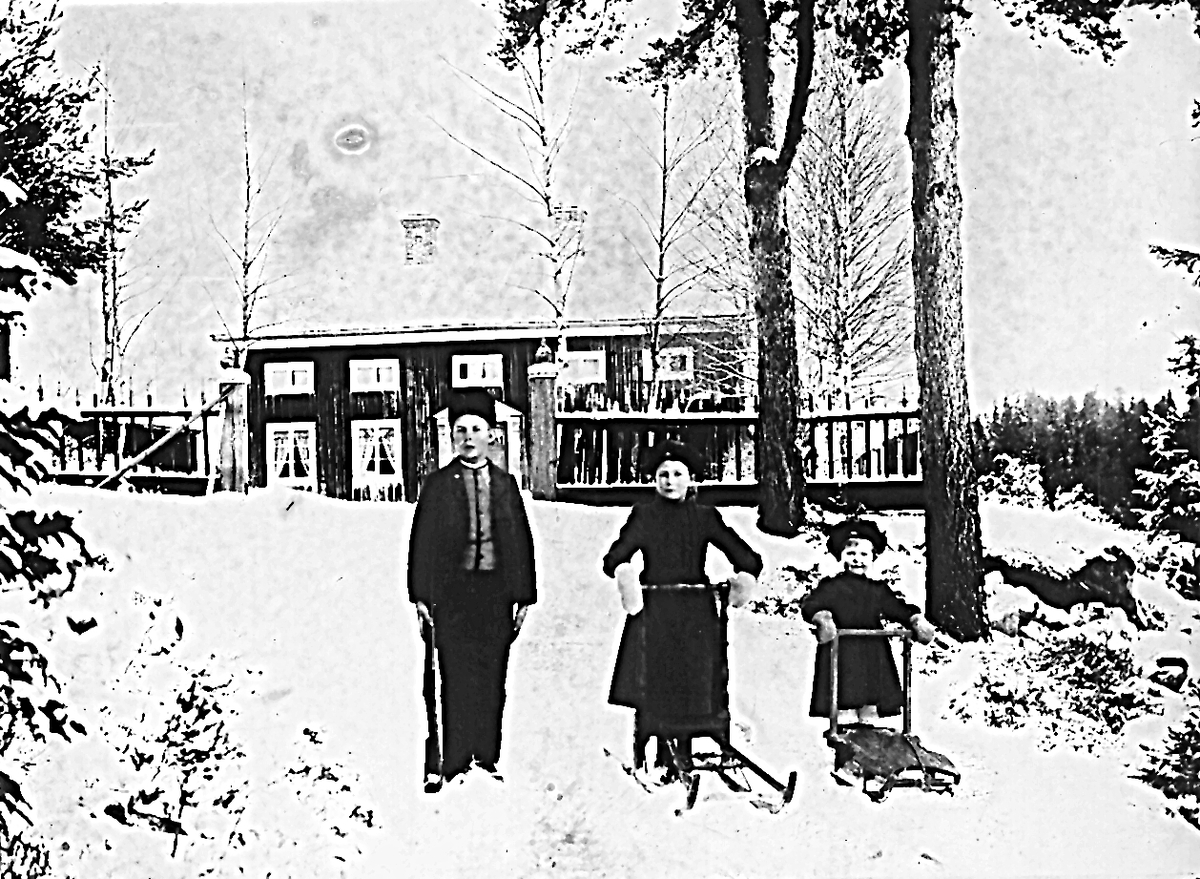 Östansjö, "Lindbergs" i bakgrunden. Barnen är Per Herman Lindberg, Ester och Elvira Lindberg. Foto: januari 1903.
