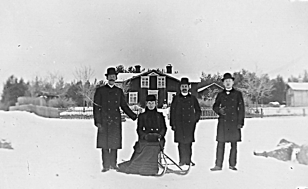Växbo: "Edlunds" i bakgrunden. David Edlund och tre okända personer.