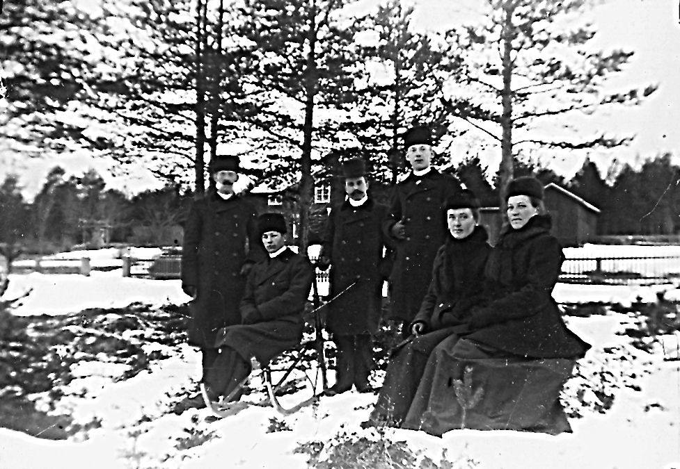 Växbo: "Edlunds" i bakgrunden. Personerna från vänster: David Edlund, två okända män, Jonathan Edlund, Ingrid Edlund, okänd kvinna.