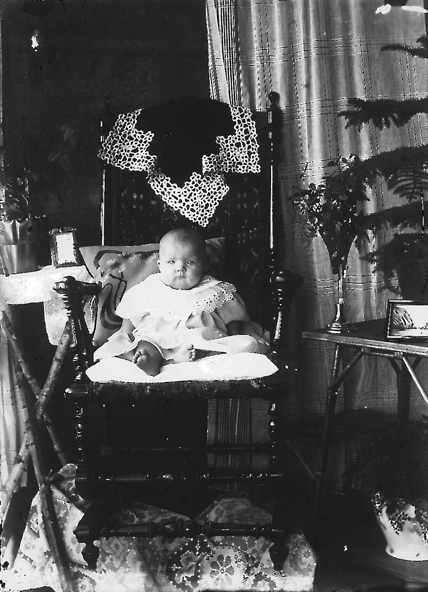 Valborg Lindberg, född Jonsson, som bodde i "Oppigårds" i Östansjö. Kortet är taget 1911. Valborg är 1 år gammal.
