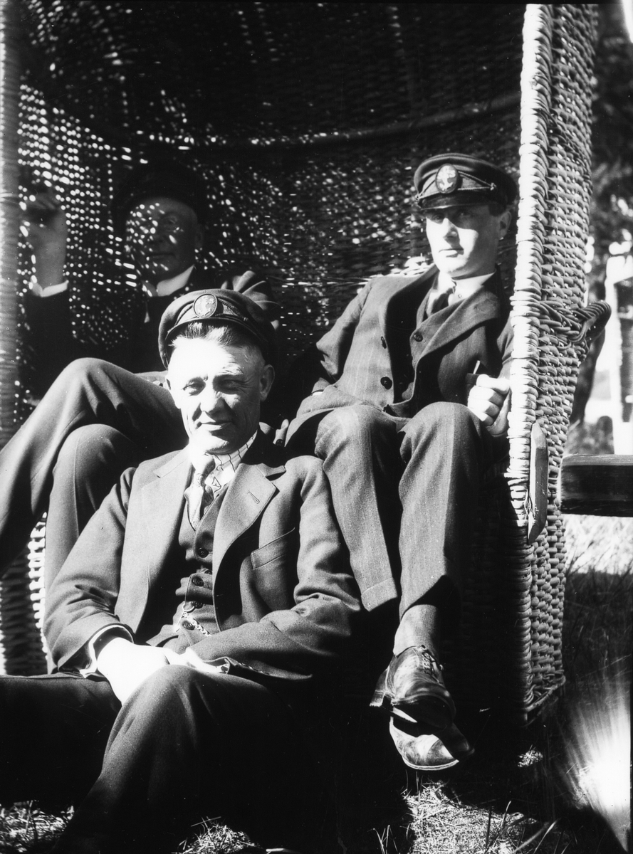 Travemünde. Grosshandlare Josef Johansson och ytterligare en man i solstolen. Disponent Werner Bengtzon framför.