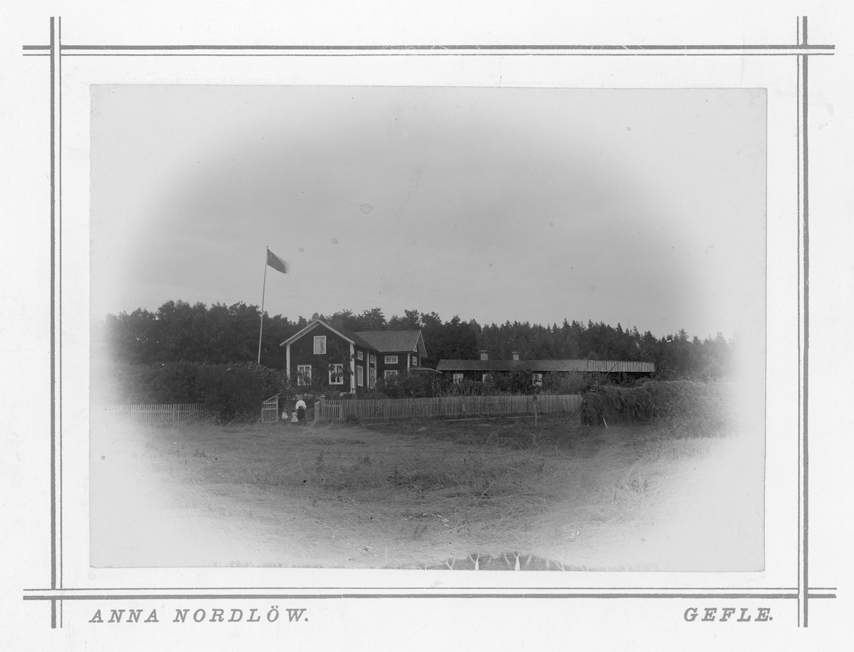 Gård i Utvalnäs. Kvinna med två pojkar utanför.