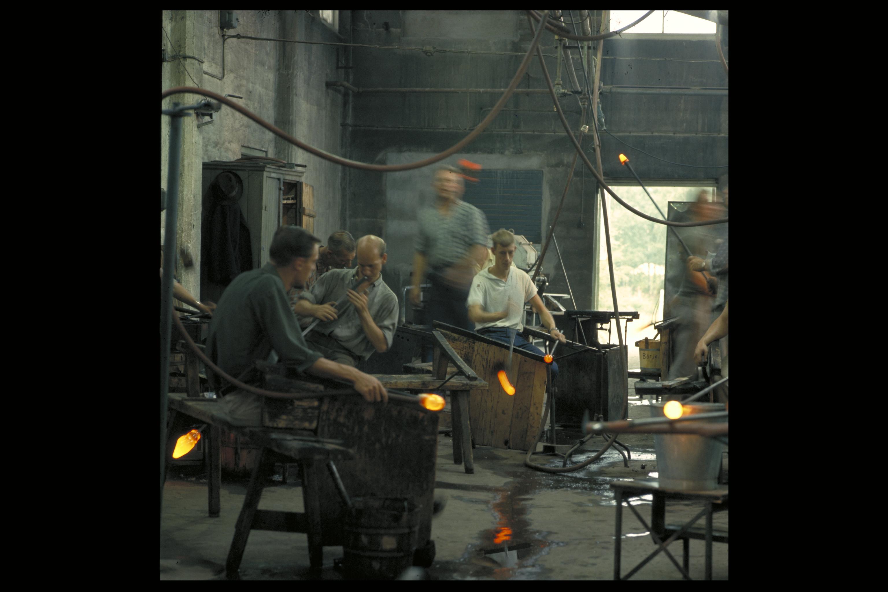 Beskrivning: Glastillverkning. Bilden troligen från slutet av 1960-talet.