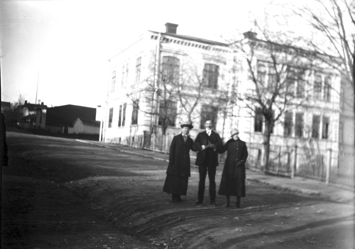 Två kvinnor och en man framför Östra skolan i Gävle.