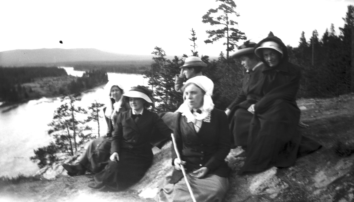 Kvinnor på utflykt vid berg med utsikt över vatten.