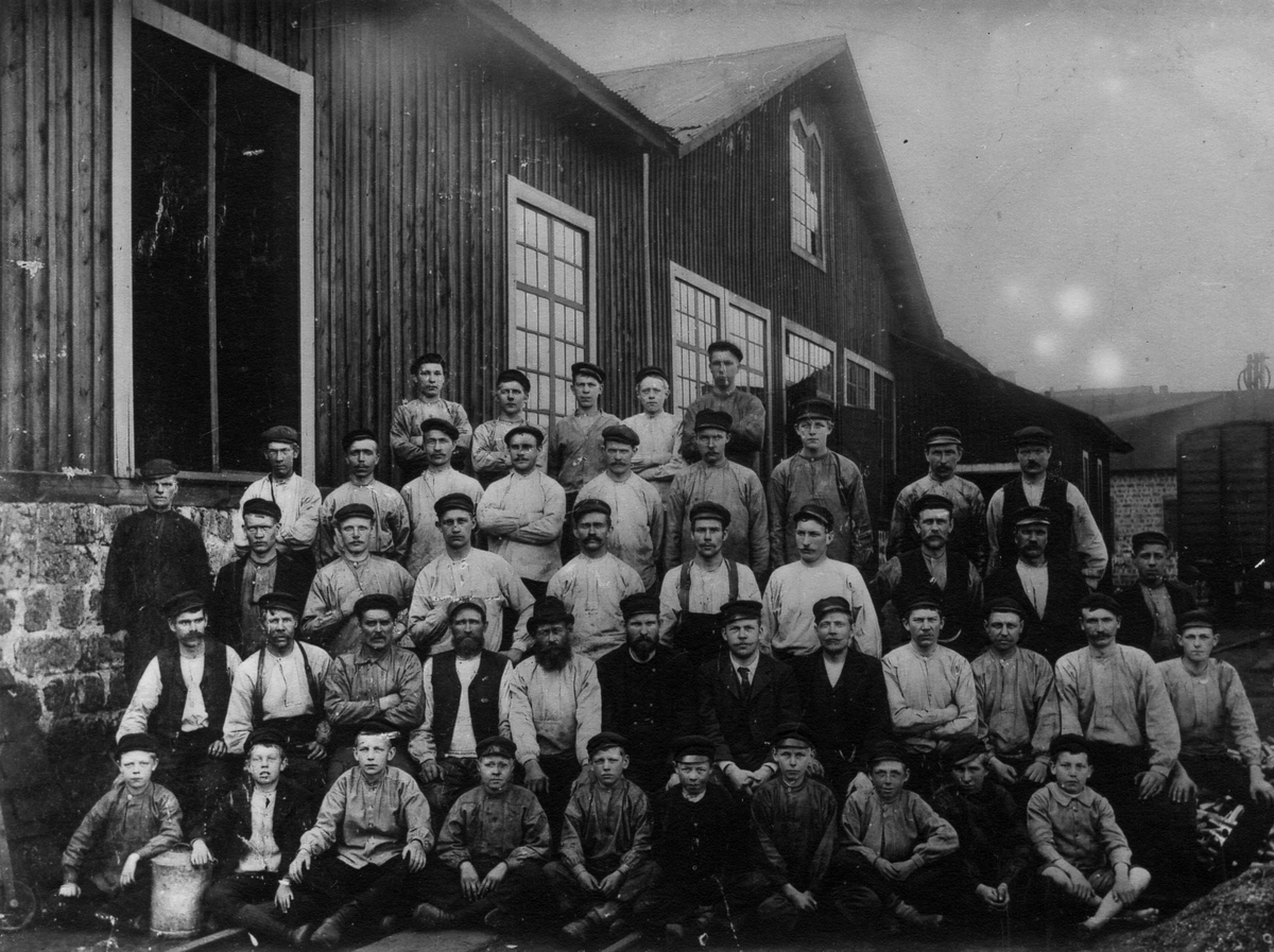 Arbetslag i tubeverket, rörvalsverket. Ordet tube är benämningen på de ämnen, som användes för att göra rör. Sedan gammalt kallades därför rörvalsverket för tubeverket. Mannen längst till vänster, andra raden nerifrån, är Lantz.