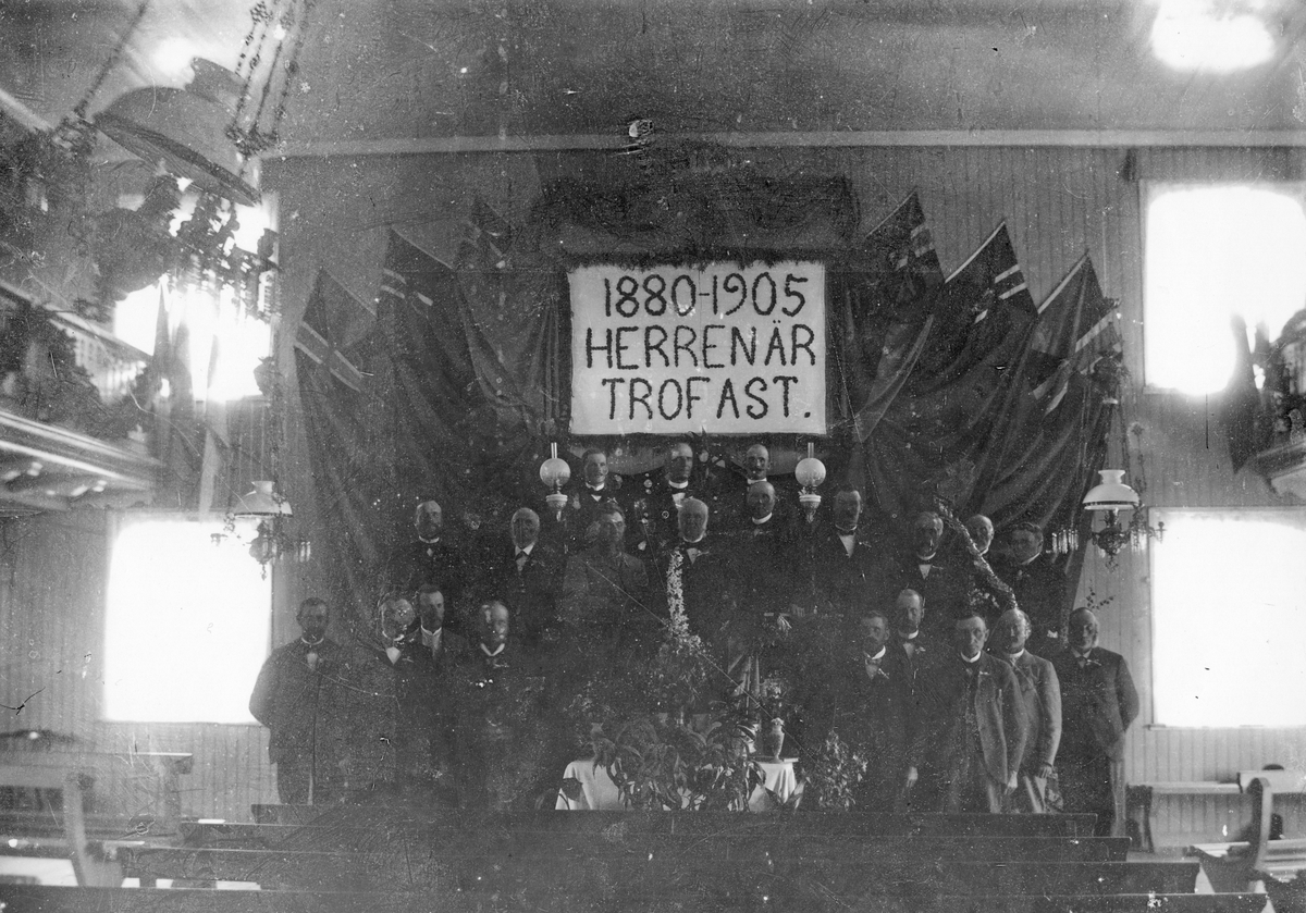 Interiör från Missionshuset i Skog. 25-årsjubileum. "1880 - 1905. Herren är trofast".
