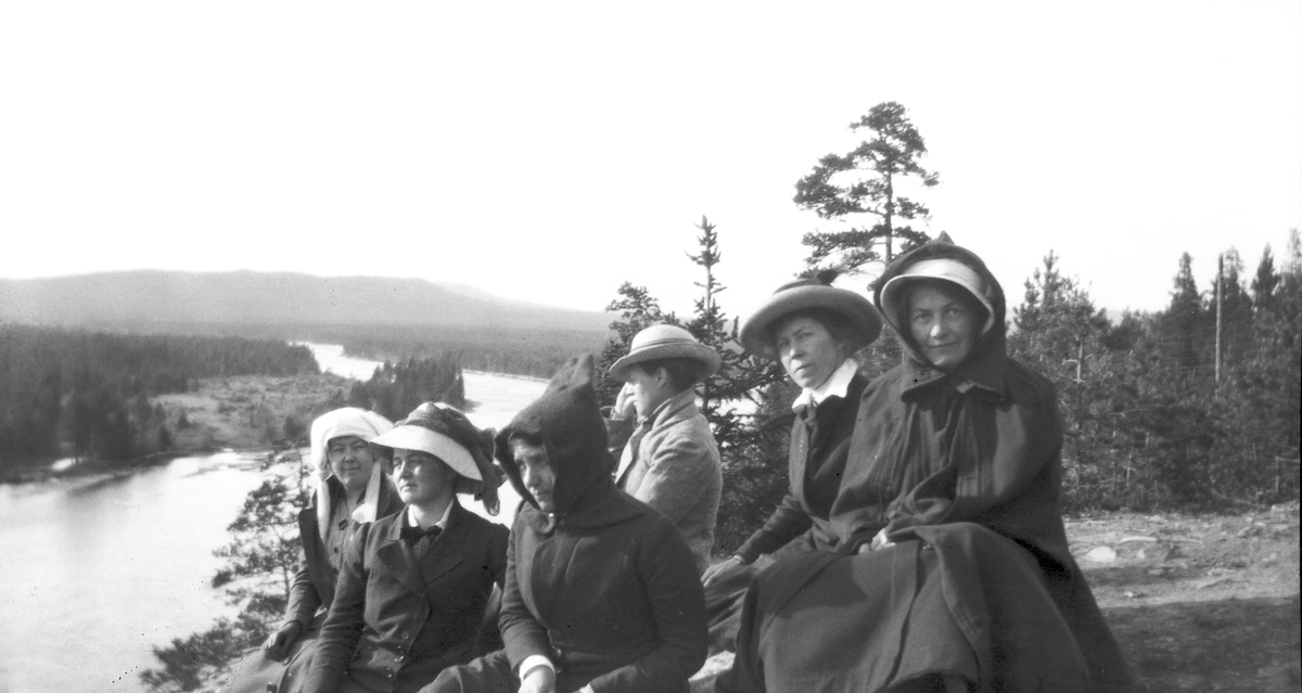 Kvinnor på utflykt på berg med utsikt över vatten.