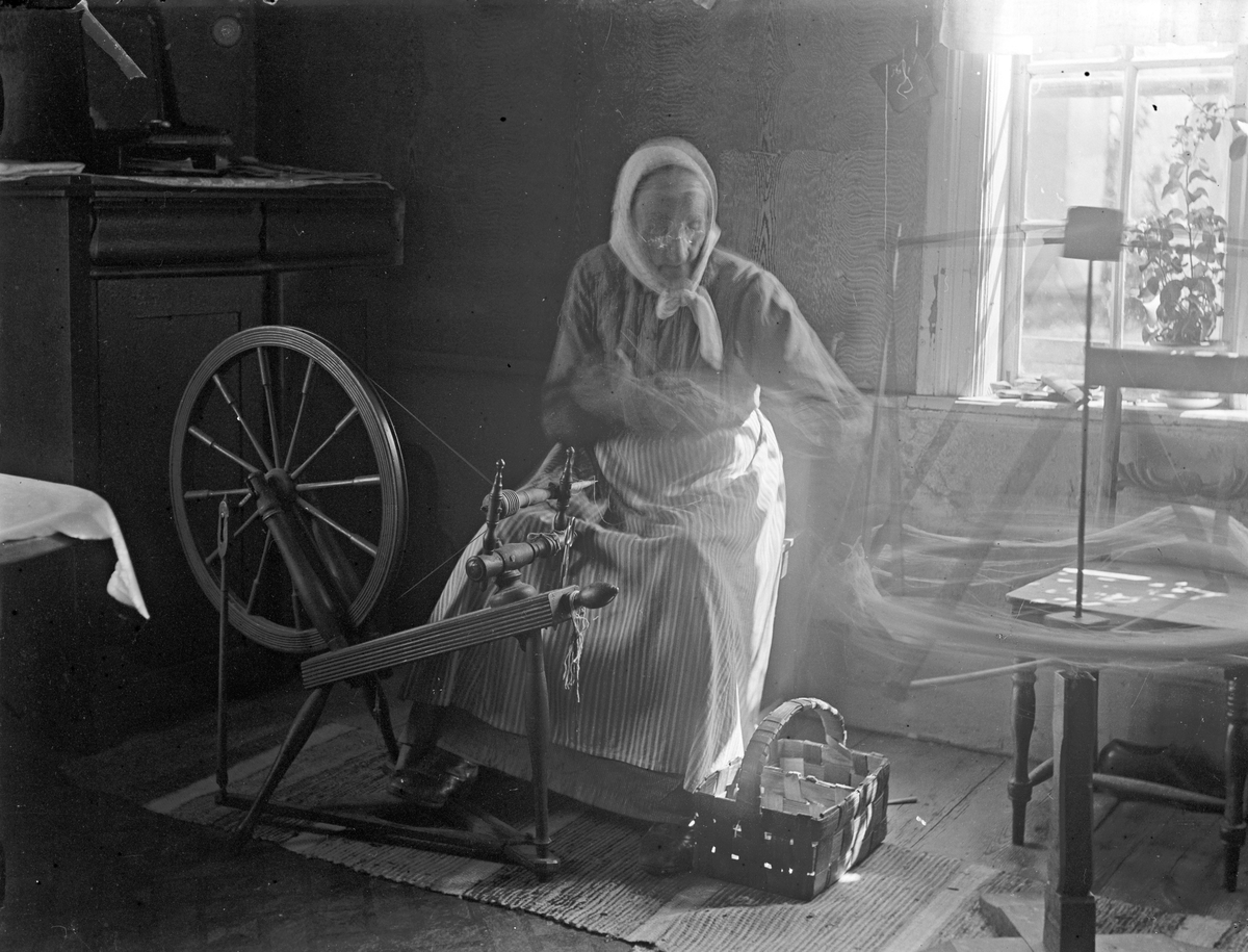 Karin Olsdotter spinner, ullkardning. Åsmundshyttan. Hon var född på "Erik-Hans" i Fagersta den 14 oktober 1835, död i Åsmundshyttan 14 mars 1930. Bilden finns med i Torsåkers Fotohistoriska Sällskap. Bild 3:9.