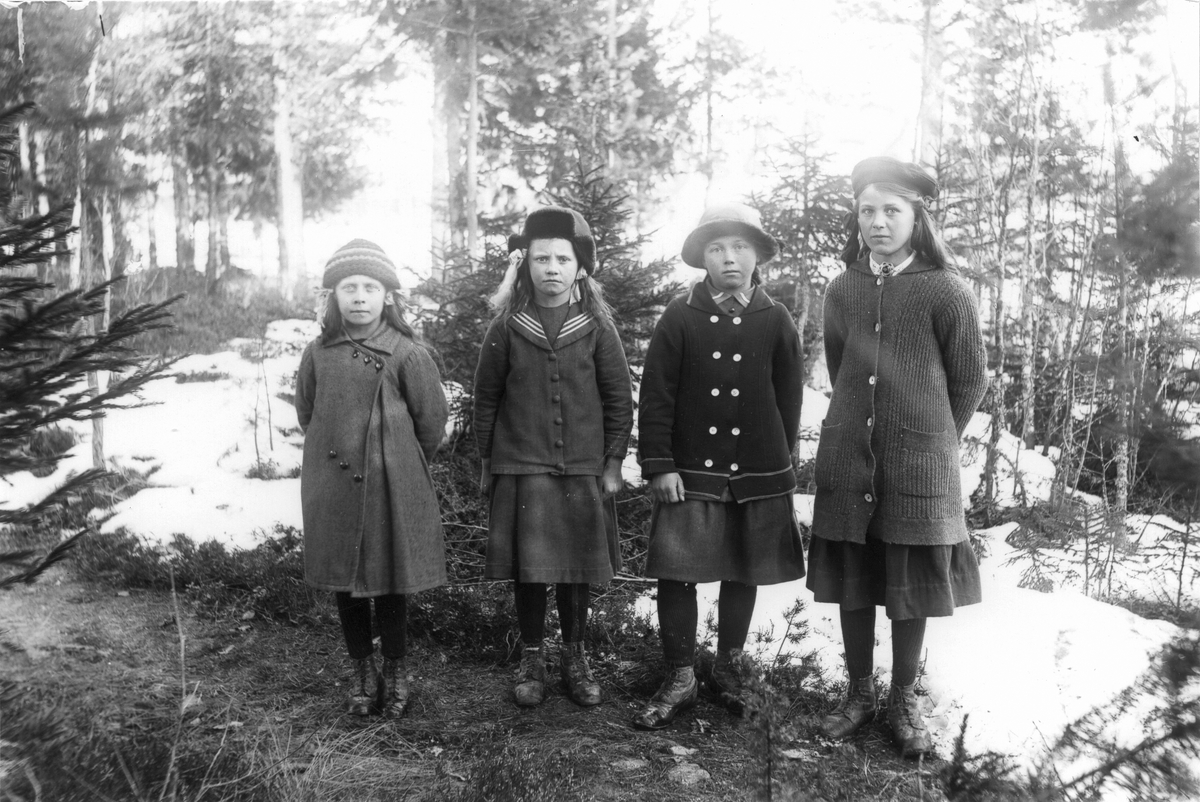 Från vänster: Skräddar-Jonases Märta (Olsson), Flyss-Elsa (Persson), Mickels-Anna och Ruth Hellberg (hennes mor var lagårdspiga i Flyss). Foto 1913.