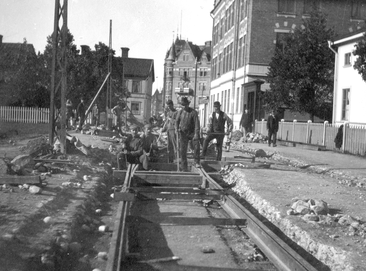 Arbete med en växel på Södra Fältskärsgatan för blivande mötesspår. Dalapalatset i bakgrunden