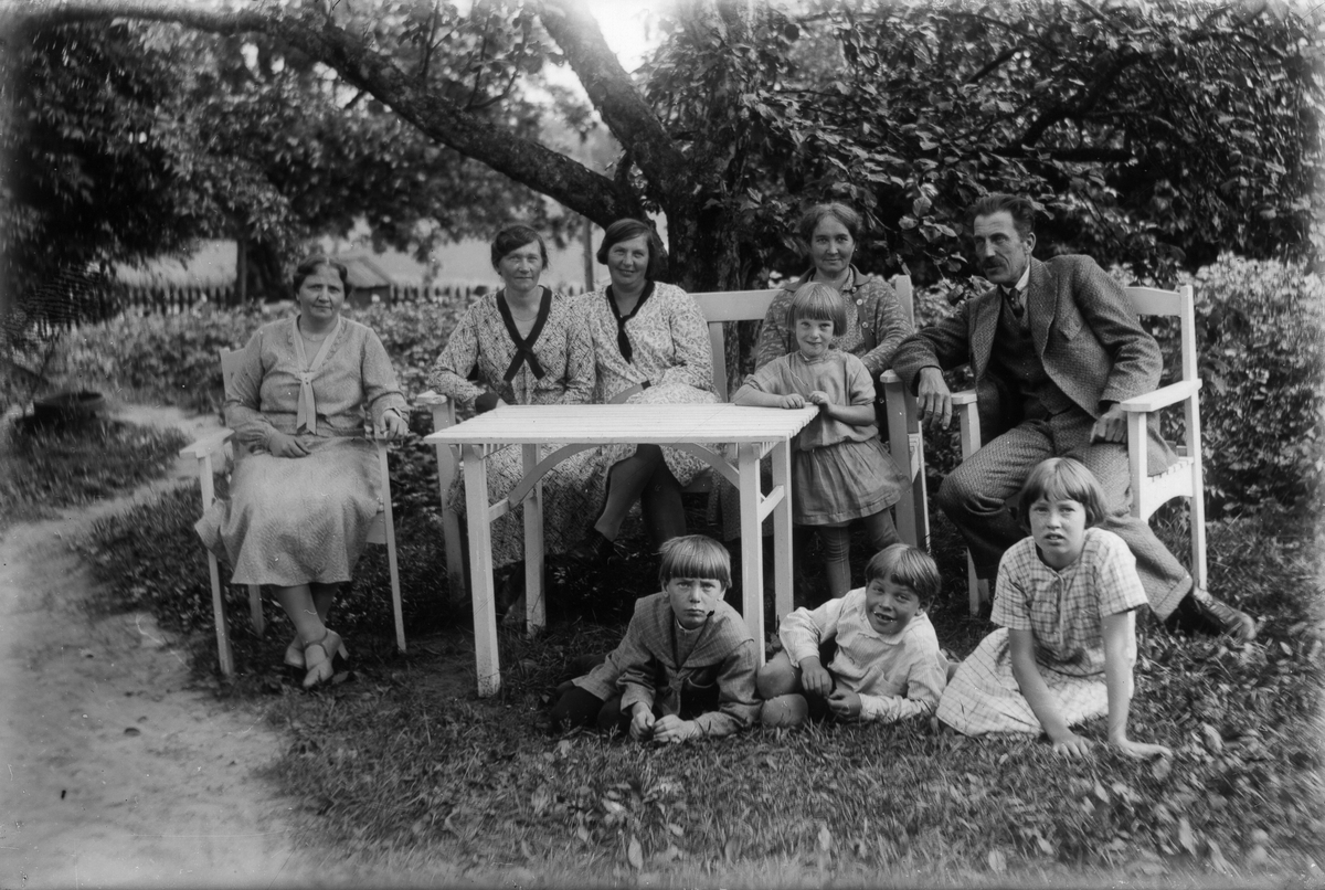 Från vänster två systrar Swanström, Målar-Astrid (Nilsson), till höger David Svensson med fru Emmy (Målars) och dottern Britt. De tre barnen nedanför är Kjell Svensson, Målar-Lars (Nilsson) och en okänd flicka.