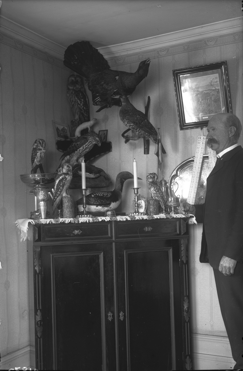 Farfar i Källsjön med uppstoppade fåglar. Foto år 1921.