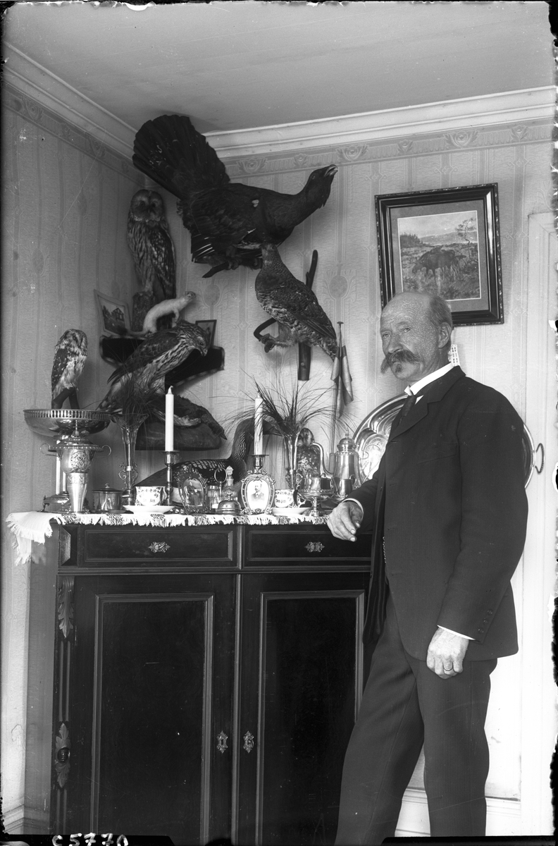 Farfar i Källsjön med uppstoppade fåglar. Foto år 1921.