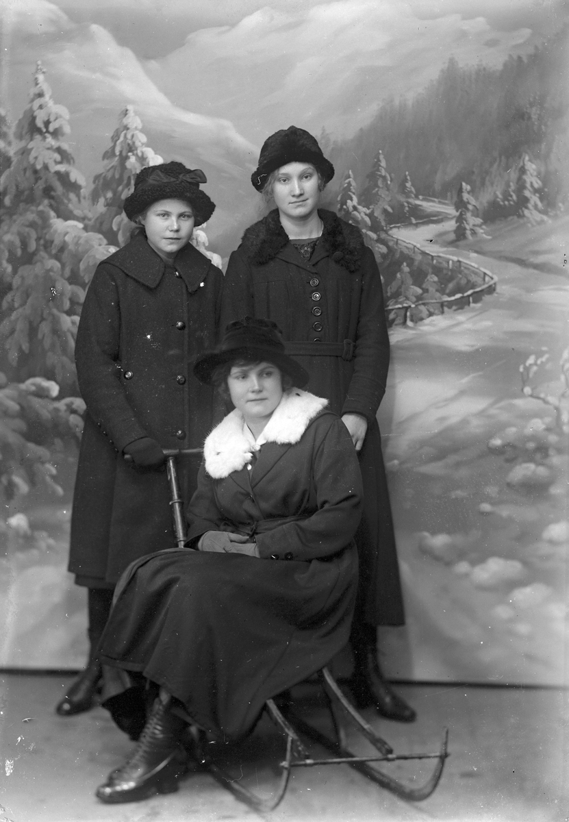 Vintermotiv, tre unga kvinnor.